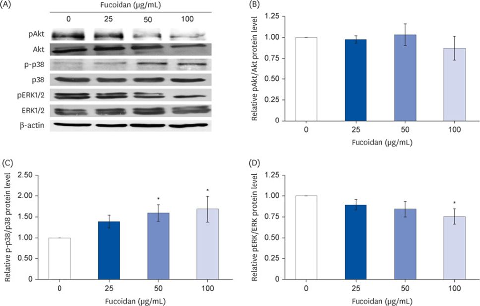 They measured the responses of the ERK1/2, p38 MAPK, and Akt signaling pathways to fucoidan treatment in A549 lung cancer cells. It was observed that fucoidan did not affect the Akt signaling pathway at any tested concentration (see Figure. 2A and B). As shown in Figure. 2A and C, Western blotting revealed that fucoidan at 50–100 µg/mL significantly increased p38 phosphorylation compared with the control group but did not alter total protein levels. Additionally, fucoidan at a concentration of 100 µg/mL demonstrably lowered ERK1/2 phosphorylation relative to the control group (see Figure. 2A and D).