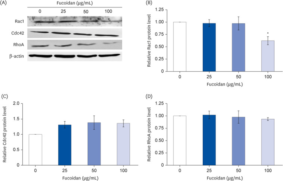 Cell migration and cytoskeletal protrusion were also regulated by downstream signaling of the Rho GTPase family. As shown in Figure 3A and B, 100 µg/mL fucoidan significantly downregulated Rac1 (relative level 0.62-fold compared to the untreated group). However, Cdc42 (Figure 3A and C) and RhoA (see Figure 3A and D) were not affected by fucoidan treatment.