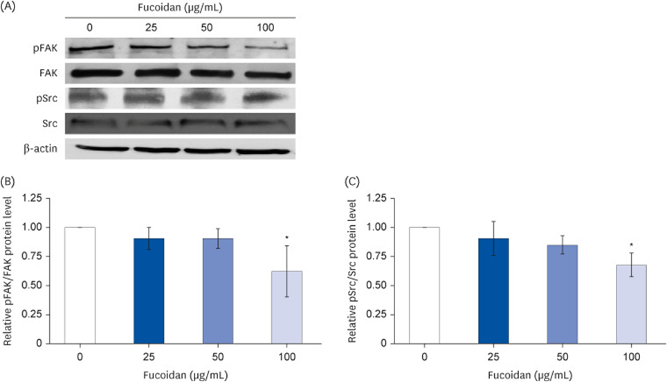 Western blot analysis was then employed to determine how fucoidan inhibits proteins involved in the process of cell migration. According to Figure 1, a concentration of 100 µg/mL of fucoidan led to a significant reduction in FAK phosphorylation (Figures 1A and 1B) and Src phosphorylation (Figures 1A and 1C) relative to the control. These results, when considered as a whole, propose that fucoidan acts to inhibit lung cancer cell migration by influencing FAK-Src signaling.