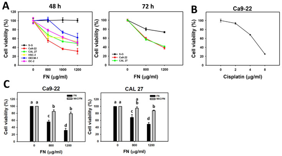 Figure. 1) Fucoidan (FN) decreases the cell viability of oral cancer cells but not non-malignant cells.
