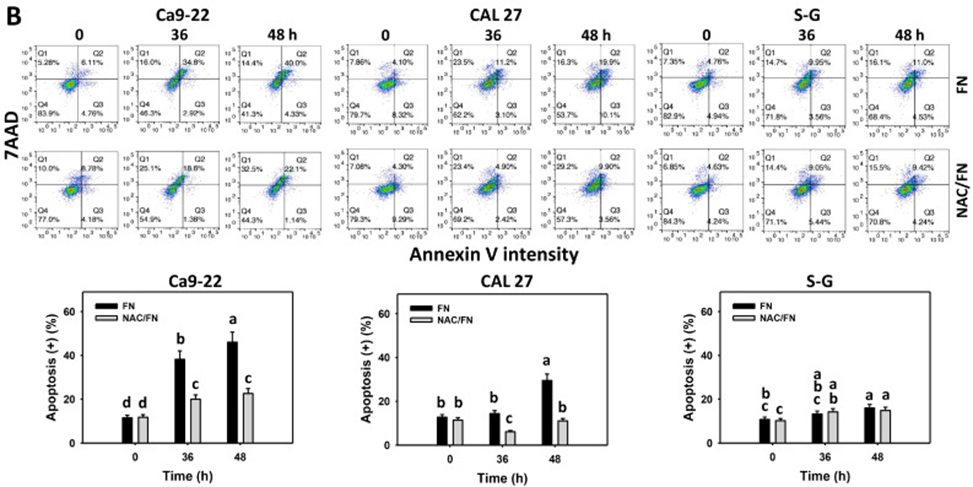 Annexin V identifies phosphatidylserine’s movement to the outer membrane, which is directly related to the extent of cell death. According to the Annexin V/7ADD assay results from experiments involving different doses and durations, fucoidan elevated the Annexin V(+) cell count in oral cancer cells (Ca9-22 and CAL27) compared to non-cancerous oral cells (S-G) (see Figure 2A, B). This suggests that fucoidan induces preferential apoptosis in oral cancer cells. Also, we were concerned about how oxidative stress affected the process of apoptosis regulation. The antioxidant NAC reversed the fucoidan-induced increase in Annexin V in oral cancer cells (see Figure 2B). The results indicate that oxidative stress is necessary for fucoidan to trigger apoptosis.