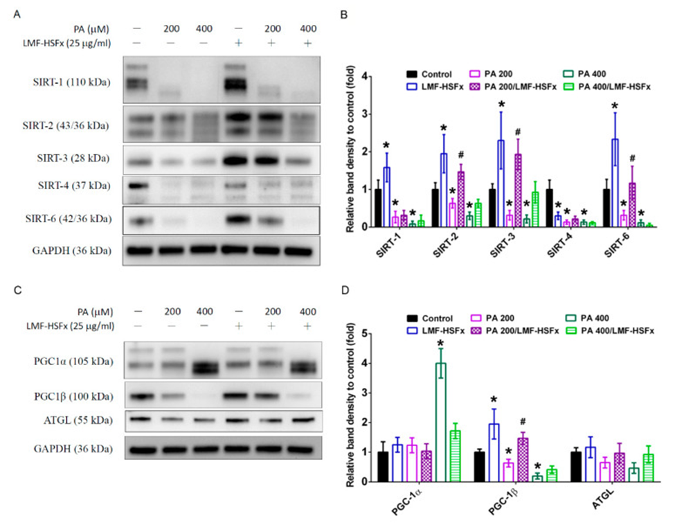 The expression of SIRT family proteins was diminished in HepaRG cells following PA-induced hepatic lipotoxicity, according to Figures 3A and 3B. This expression is regulated by the leptin-adiponectin axis. Additionally, PA treatment markedly triggered SIRT cleavage or reduced expression proportionally with the dose. In contrast, LMF-HSFx effectively reversed the PA-induced breakdown of SIRT2, 3, and 6 (see Figure 3A). SIRT1, SIRT3, and SIRT6 levels were significantly increased in the LMF-HSFx group compared with the control group (see Figure 3B). Furthermore, PA-treated hepatocytes showed a dose-dependent increase in PGC-1α but a decrease in PGC-1β, and LMF-HSFx significantly restored these effects (see Figure 3C, D). Consequently, the level of adipose triglyceride lipase (ATGL), a downstream lipid metabolism-related protein, was also significantly restored by treatment with 25 μg/mL of LMF-HSFx (see Figure 3C, D).