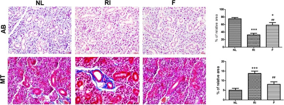 Following 12 weeks of RI administration, histological alterations within the SG were visualized using H&E, AB, and MT staining techniques. Morphometric analysis of AB staining, which indicates mucin density, showed that mucin production decreased in the RI group compared with the normal group. However, mucin production was significantly increased in the fucoidan-treated group compared with the RI group (Fig. 1, p<0.05). Through MT staining to assess the extent of fibrosis, it was observed that the RI group displayed the most significant degree of fibrosis compared to the normal group. Conversely, the fucoidan group showed a reduced level of fibrosis relative to the RI group (as can be seen in Figure 1, with a statistically significant p-value less than 0.05).