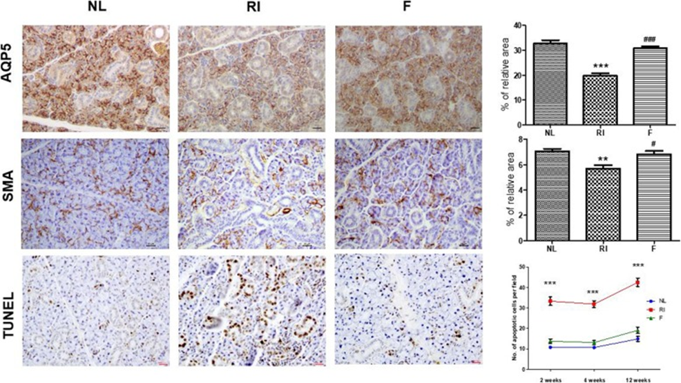Figure. 2) Immunohistochemistry and TUNEL assay of salivary glands at 12 weeks post-RI treatment.