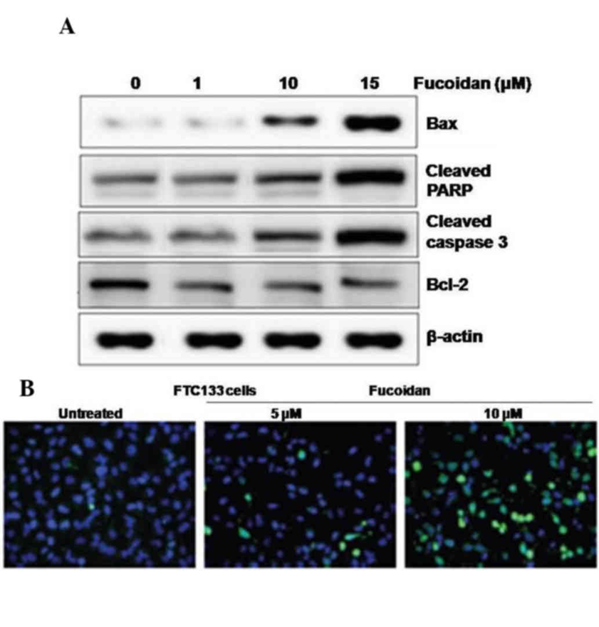Western blot analysis showed that the effect of fucoidan on apoptotic cell death in FTC133 ATC cells was increased expression of Bax, cleaved PARP, and caspase-3, and decreased expression of Bcl-2 in FTC133 cells after 36 h of fucoidan treatment compared to control cells (Fig. 2A). DAPI staining revealed DNA fragmentation and the appearance of apoptotic bodies at the nuclear periphery in 8 µM fucoidan-treated FTC133 cells (Fig. 2B). Fucoidan induced apoptosis in FTC133 cells. This was indicated by DNA strand breaks and was also observed by TUNEL staining.
