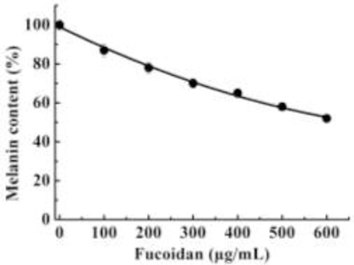 Cell viability was examined to elucidate the impact of fucoidan on the creation of melanin within cells. The effect of different concentrations of fucoidan (0–600 µg/mL) on B16 melanoma cell proliferation was assessed using a CCK-8 assay to measure cell viability. The addition of fucoidan dose-dependently affected B16 melanoma cell proliferation. Fucoidan dose-dependently reduced the number of viable cells, and after the addition of 600 µg/mL of fucoidan, cell viability decreased to 46.37 ± 2.6%. The IC50 was 530 ± 3.32 µg/mL. Fucoidan not only inhibited tyrosinase activity but also showed excellent inhibitory effects on melanocytes. The data indicate that fucoidan effectively lightens skin at both the molecular and cellular levels.