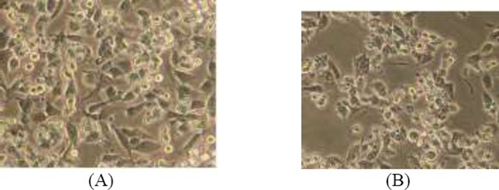 Figure 3) Effects of fucoidan on B16 melanoma cells morphology (100 ×, scale bar 100 μm)(A) control group (B) experimental group (550 μg/ml fucoidan).