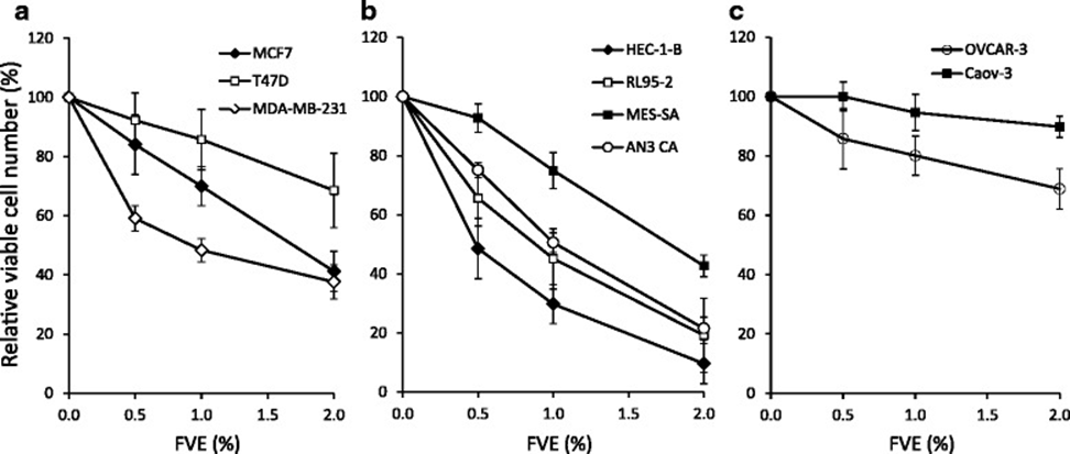 These findings provide further evidence of the antiestrogenic activity of FVE, involving inhibition of E2-mediated ER activation and E2 synthesis. This activity suggests that FVE may confer beneficial protective effects against estrogen-dependent breast, endometrial, and ovarian cancers. Furthermore, inactivation of the PI3K/Akt/mTOR pathway reduced the viability of FVE-treated ER-positive and -negative cancer cell lines, suggesting that FVE may be useful in the treatment of some breast, endometrial, and ovarian cancers, regardless of ER status.