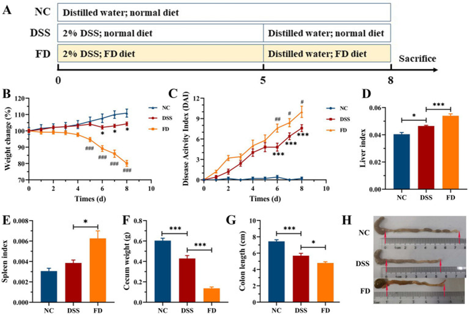 The effect of FD on colitis was first evaluated in mice administered 2% DSS (Figure 1). Mice in the model group showed clear symptoms of colitis, characterized by decreased body weight, cecum weight, and colon length, as well as increased liver index and DAI. FD exacerbated the aforementioned colitis symptoms, with a clear increase in splenic index. This suggests that FD may increase susceptibility to IBD in humans. This is similar to the high susceptibility of mice fed a fiber-free diet to DSS-induced colitis.