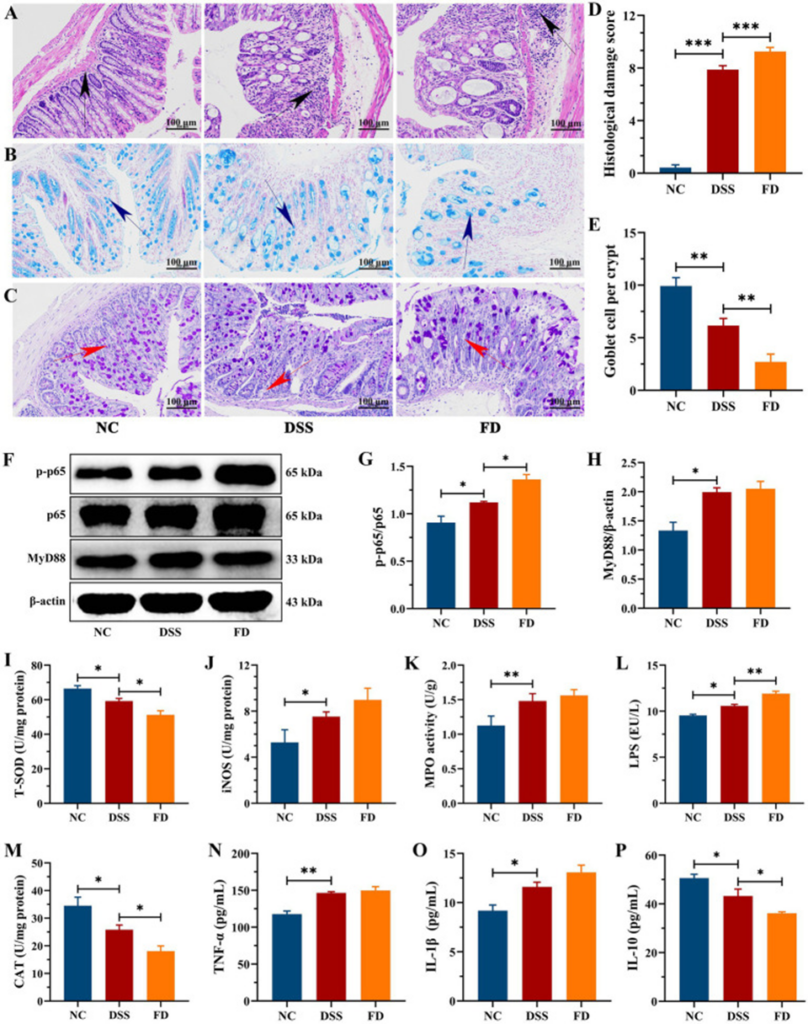 The HE staining showed substantial colon damage in the DSS group, with inflammatory cell infiltration, crypt loss, and mucosal erosion, resulting in a high histological score (as shown in Figure 2A and D). The mucus layer’s integrity was found to be compromised in the DSS group, as shown by AB and PAS staining. This was marked by a reduction in goblet cell count, a significant drop in glycoprotein density, and a thinner mucus layer (see Figure 2B, C, and E). The DSS group had higher levels of TNF-α and IL-1β and lower levels of IL-10 than the NC group (Figure 2N–P). This indicates that DSS treatment caused colonic inflammation. FD exacerbates colitis, as evidenced by increased crypt loss, inflammatory infiltration, and IL-1β levels, but also decreased IL-10 levels and mucus layer thickness. These findings point to a connection between FD and the beginning and worsening of inflammatory bowel disease (IBD).