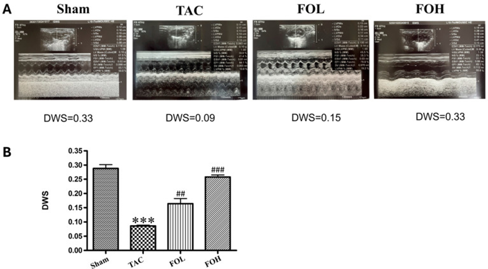 Echocardiographic evaluation revealed differences in structural parameters between the experimental groups (Figure 1A), with improved cardiac function observed in the fucoidan-treated group. Fucoidan treatment led to considerable improvements in key parameters like diastolic wall strain (DWS), while the TAC-treated group demonstrated a partial recovery in ejection fraction when contrasted with the group that didn’t receive treatment (Figure 1B). These findings suggest that the anti-inflammatory and antioxidant properties of fucoidan play a role in cardio protection during hypertrophic stress.
