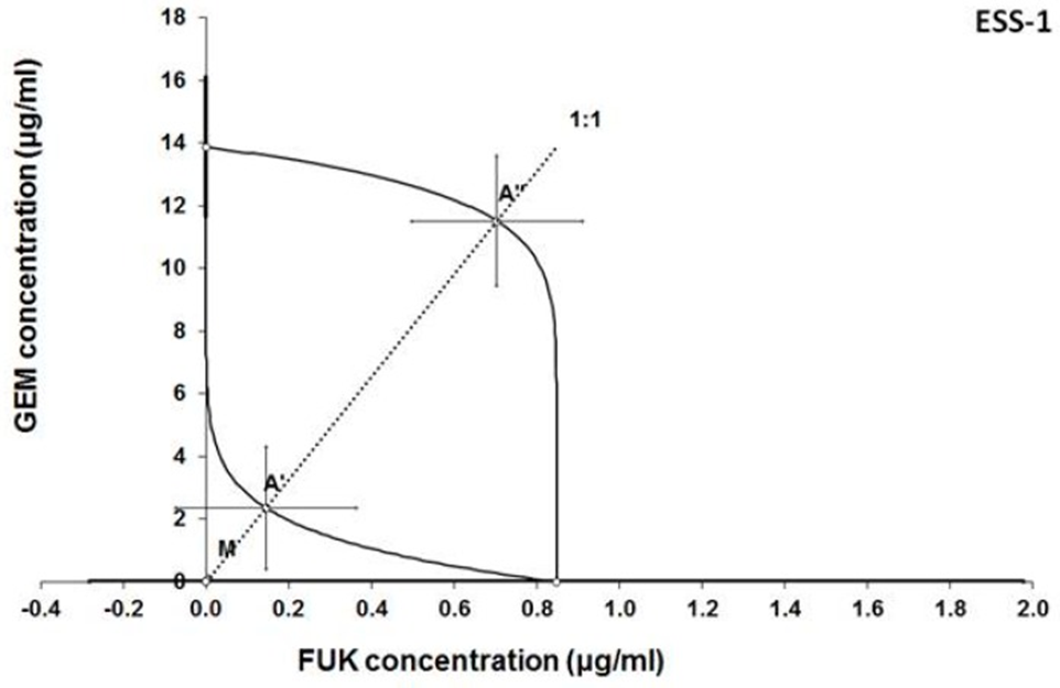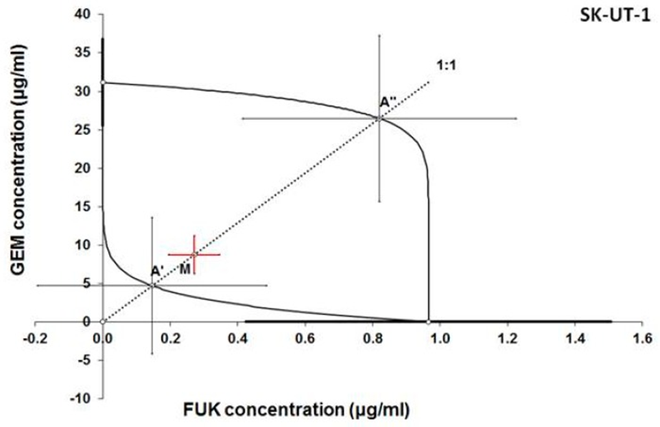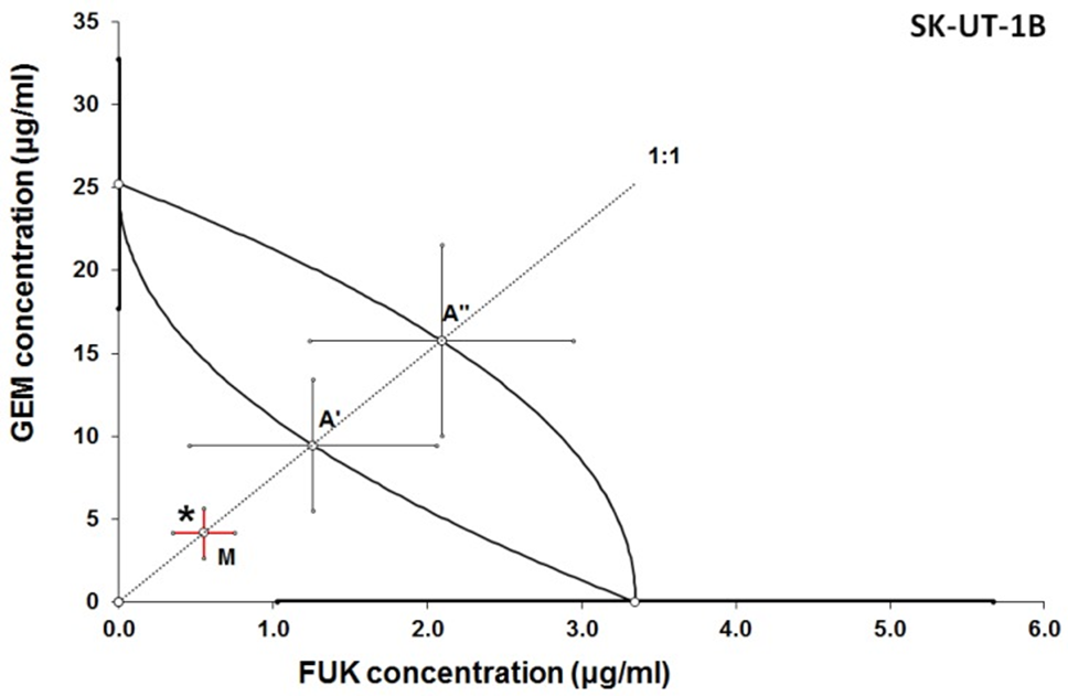 Cells were incubated in the presence of gemcitabine, fucoidan, and the mixture, and MTT tests were performed after incubation. The interaction of the compounds was assessed using isobolographic analysis. The results obtained by isobolographic analysis are shown in Figures 1, 2, and 3, where the median inhibitory concentrations (IC50) of gemcitabine (GEM) and fucoidan (FUK) are plotted on the X-axis and Y-axis, respectively. Additive effects of gemcitabine and fucoidan combination treatment were observed in ESS-1 and SK-UT-1 cell lines. Synergistic effects were observed in SK-UT-1B cell line. Due to the MES-SA cell line’s poor response to the treatment, the relationship between fucoidan and gemcitabine couldn’t be established.