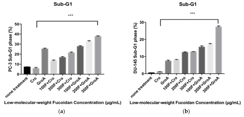 The study first investigated how serum starvation impacted each cell line before evaluating the apoptosis-inducing effects of various Fucoidan preparations. The sub-G1 population was used as an index of apoptotic DNA fragmentation [32]. LMWF was found to increase the sub-G1 cell population in a dose-dependent manner, while it decreased the G0-G1 population in both PC-3 and DU-145 cell lines (see Figure 1). The combination of LMWF and GroA boosted apoptotic cell death in both PC-3 and DU-145 cell lines, evidenced by an increase in the sub-G1 population reaching 37.61% at the maximum LMWF concentration. The percentages of sub-G1 populations were higher in all the combined treatments compared to each of the treatments alone. The combination of LMWF and GroA, therefore, resulted in a synergistic effect. The cell cycle distributions, as measured, showed that both GroA and LMWF halted the sub-G1 phase, despite their distinct impacts on cellular metabolism. Furthermore, the accumulations of G0-G1 phase cells decreased dramatically to 37.31% in cells treated with a concentration of 300 µg/mL LMWF.