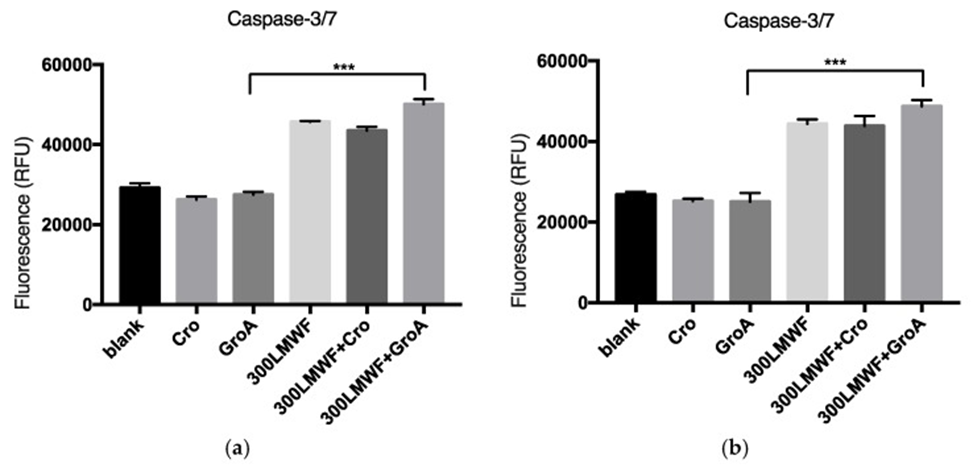 They explored if the cell death was caspase-dependent to learn more about it. For a duration of 72 hours, the researchers administered LMWF at a concentration of 300 µg/mL to cells, either independently or alongside GroA/CroA. Subsequently, they determined the levels of caspase 3/7 activity and analyzed how effectively it functioned within the different combination treatments. They found that LMWF increased the levels of caspase 3/7 activity in both PC-3 and DU-145 cell lines (see Figure 2). The combination of GroA and LMWF boosted the effect of LMWF, although GroA alone did not elevate caspase 3/7 levels. These results may suggest that LMWF controls the sequential activation of apoptotic cell death and that at least part of the cell death observed with LMWF and GroA is caspase-dependent.