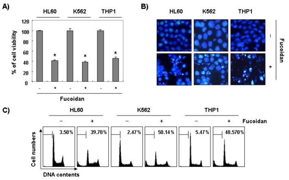 Beyond this, the research indicated that fucoidan played a significant role in diminishing the survival rate of cells and initiating the process of apoptosis in various other types of leukemia cells, such as HL60, K562, and THP1, which is further illustrated in Figure 2. These findings indicate a link between the growth inhibition seen with fucoidan and the triggering of apoptosis in leukemia cells.