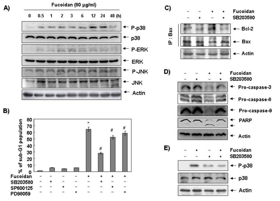 The absence of a significant effect when fucoidan treatment was preceded by PD98059 (a strong ERK inhibitor) or SP600125 (a strong JNK inhibitor) points to a direct correlation between fucoidan-induced apoptosis and p38 MAPK activation in U937 cells. To further elucidate the mechanism of fucoidan-induced p38 MAPK activation in U937 cells, we examined the binding of Bcl-2 and Bax and the expression levels of caspases. As shown in Figure 3C, pretreatment with a p38 MAPK-specific inhibitor significantly reduced the fucoidan-induced increase in Bcl-2 and Bax binding in U937 cells. The fucoidan-induced decline in procaspases 3, 8, and 9, as well as PARP cleavage and p38 MAPK phosphorylation, was restored by p38 MAPK inhibition (see Figures 3D and 3E). The data imply that fucoidan-stimulated p38 MAPK activation leads to caspase activation by facilitating Bax’s relocation from the cytoplasm to the mitochondria, culminating in programmed cell death.
