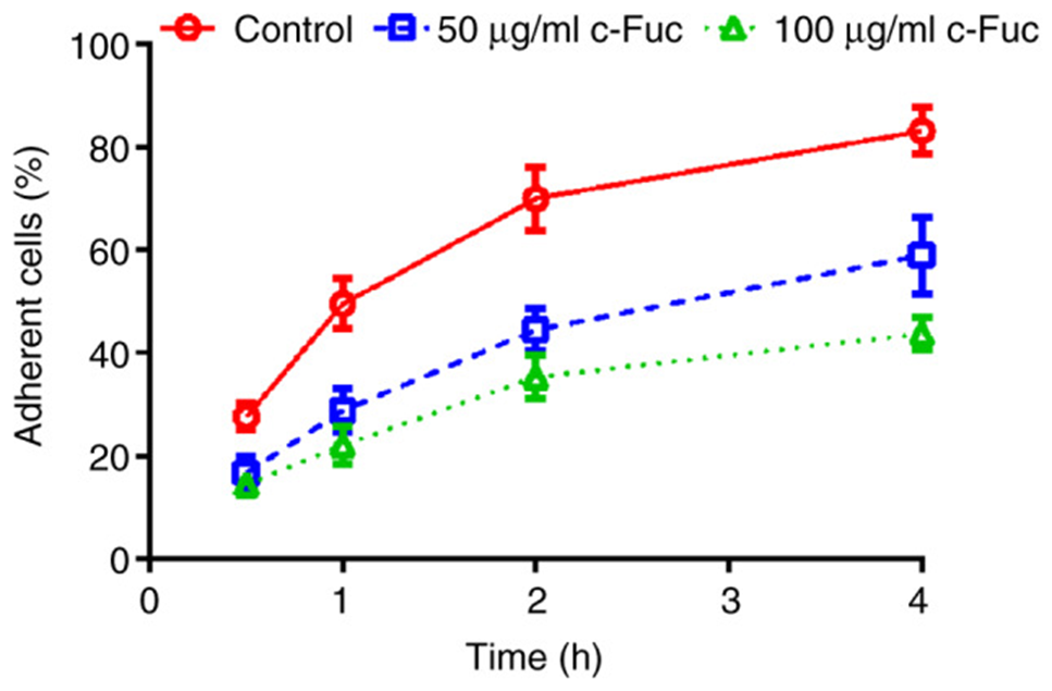 First, to evaluate the inhibitory effect of Cf-Fuc on U2OS cell adhesion and migration, they selected the non-cytotoxic concentrations of 50 and 100 µg/ml in the following experiments. As shown in Figure 1, the adhesion rate of untreated U2OS cells gradually increased and finally reached 83.2% at 4 h. Meanwhile, the adhesion rate of Cf-Fuc-treated cells increased slowly, indicating that Cf-Fuc treatment can inhibit U2OS cell adhesion when the Cf-Fuc concentrations were 50 µg/ml and 100 µg/ml.