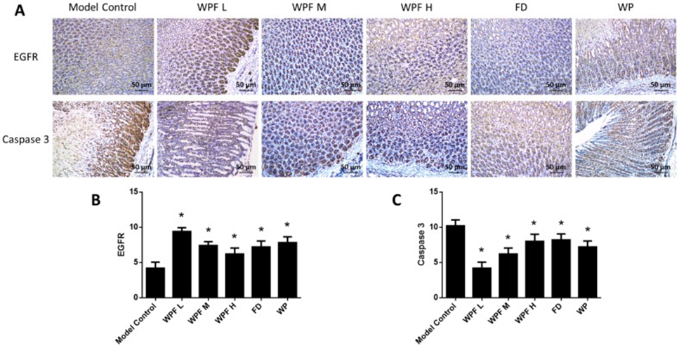 The secretion of PGE2 and EGF, which are crucial for protecting the stomach lining, was markedly reduced in a gastric mucosal injury model. However, WPF stimulated the production of both PGE2 and EGF and enhanced cell survival (see Figure 2C, D). Furthermore, semiquantitative immunohistochemical analysis of gastric tissue revealed that WPF administration also induced EGFR expression (see Figure 2A, B) and reduced the expression of the apoptosis-inducing factor caspase-3 (see Figure 2A, C), suggesting the pro-survival effect of this formulation.